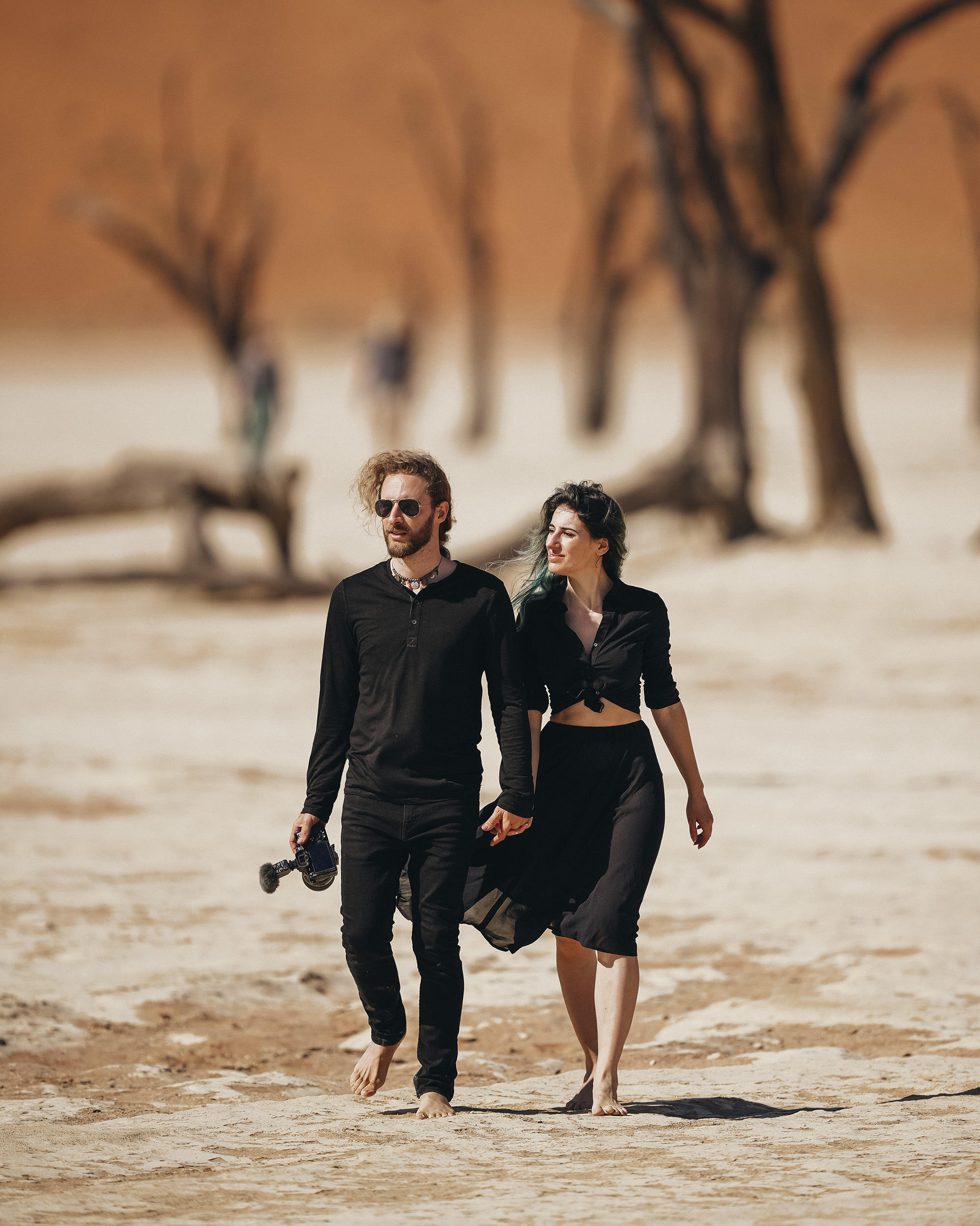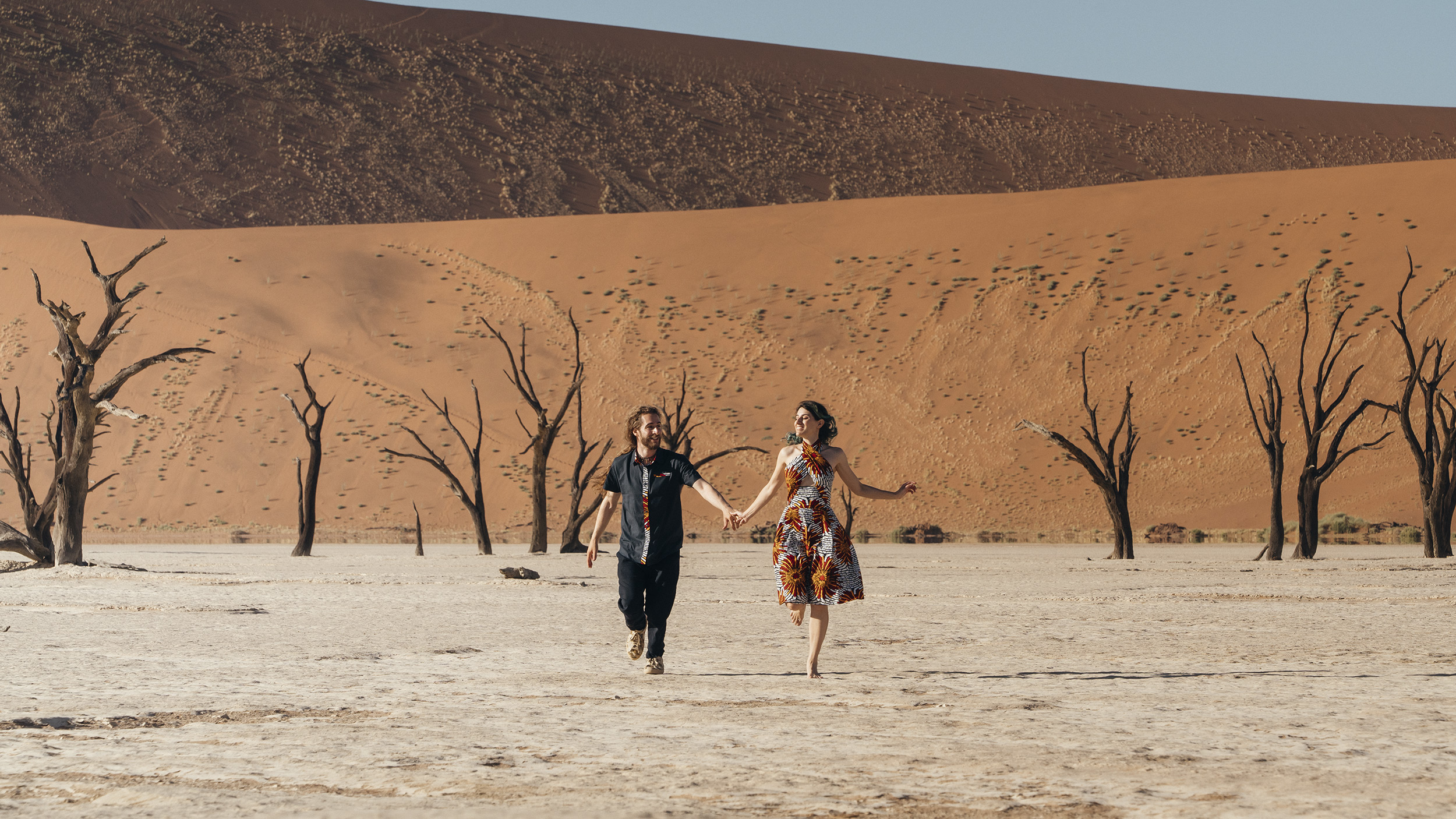 Abbiamo potuto respirare l'aria salata che dall'oceano veniva trasportata sulle alte dune del deserto a Sandwich Harbour, abbiamo camminato in paesaggi che sembravano alieni, come l'infinita distesa bianca dell'Etosha National Park o Deadvlei, la piana salata su cui si ergono scheletri di antichi alberi stagliandosi su dune rosse. Abbiamo ammirato maestose giraffe e orici, e sussultato quando i fulmini illuminavano la savana.