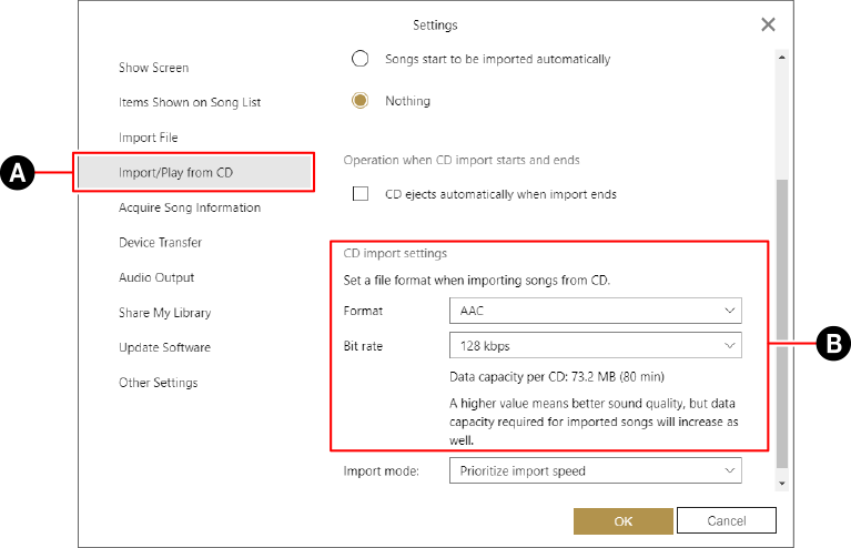 , quindi selezionare [Formato] e [Frequenza dei bit] sotto [Impostazioni di importazione dal CD]