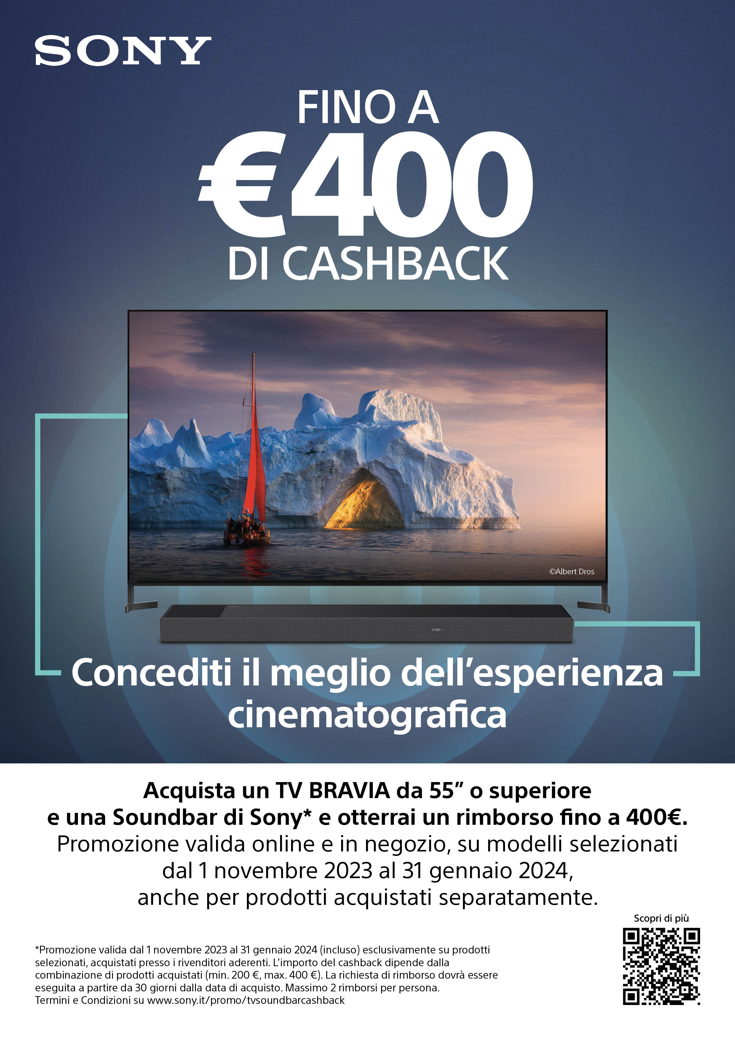Al via dal 1° novembre la promozione di Sony per l’acquisto di un TV BRAVIA - da 55 pollici o superiore - e di una soundbar, per ottenere un rimborso fino a 400€.